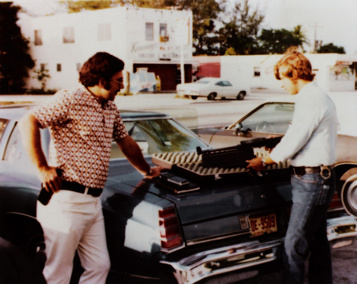 迈克•吉尔(右)与他的搭档盖瑞•P•钟斯(左)及他所使用的American-180,枪管下挂着的大型“护木”就是Laser Lok。后来盖瑞写了本书《BADGE 149 SHOTS FIRED》描述了这次枪战的所有细节。
