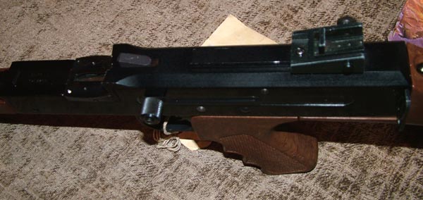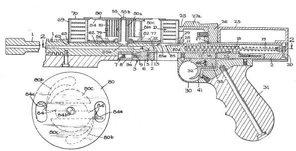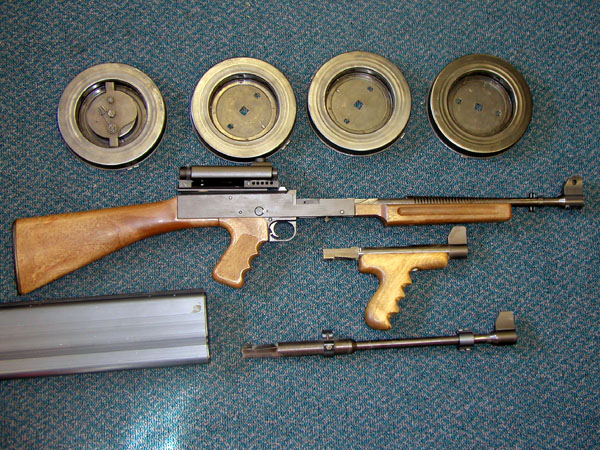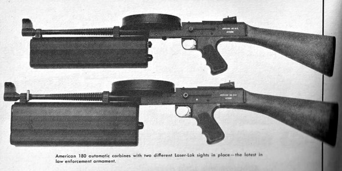 把照门换成激光指示器的American-180,在左下方的方块物件就是Laser Lok。由于1971年的激光器还不像现在的那么小型,因此Laser Lok的尺寸很大。上面的4个弹鼓中,除了最左边一个装有卷簧器外,另外三个都没有安装卷簧器。