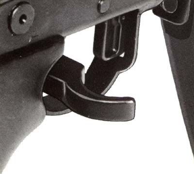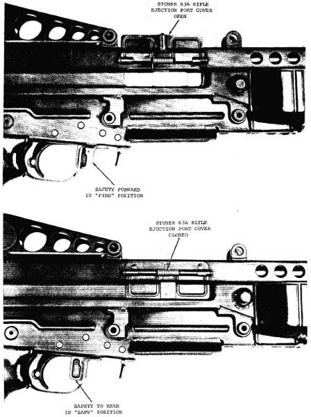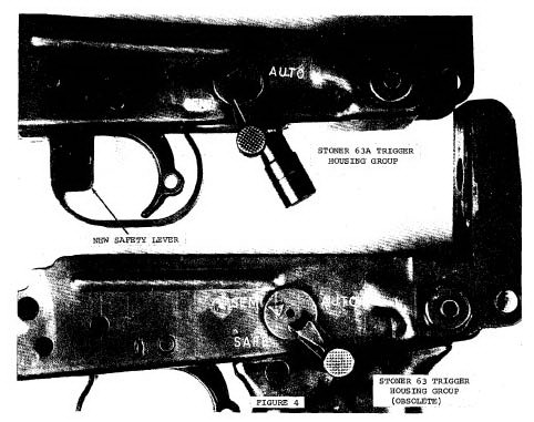 ![]() 斯通纳63A(上)把手动保险改到扳机护圈前方,而斯通纳63(下)的的快慢机则有保险档 |