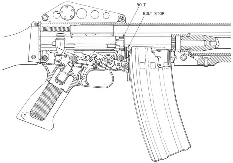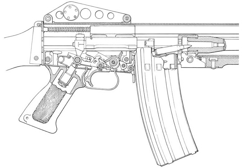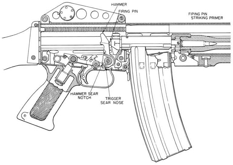 由于发射机构中没有击锤和连发阻铁,所以待发时,击发阻铁直接卡入机框底部的阻铁卡槽中,将枪机、机框挂在后方位置。扣压扳机后,在复进簧力的作用下,枪机、机框和活塞组件一起向前运动,枪机并完成取弹、推弹入膛和闭锁等三个动作。当机框离前方位置约4mm时,枪机完全闭锁。随后,机框继续复进到位,固定于机框上的击针自枪机弹底窝平面中伸出,打击底火,击发枪弹。枪弹击发后,在火药气体压力作用下,活塞和机框后座。机框走完5mm的自由行程,枪机开始开锁。机框后座6.35mm后,枪机完全开锁。在枪机开锁的同时,拉壳钩开始抽出弹壳。