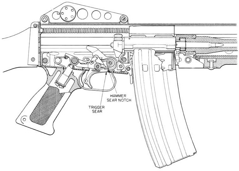 半自动射击时,将快慢机柄装定于“R”位置。击发后,只有松开扳机,单发杆才能与击锤解脱,使击锤重新与击发阻铁扣合而成待发状态。全自动射击时,快慢机柄装定于“A”。此时,单发杆后移,不能与击锤扣合。每当工作部件向前复进,击锤也要向前回转,但随之为连发阻铁(到位保险阻铁)阻挡。闭锁后,机框继续向前,机框尾铁撞击不到位保险阻铁连杆,并使其向前。当机框离最前方位置尚有1.857mm时,连发阻铁解脱击锤,击锤打击击针而击发枪弹。