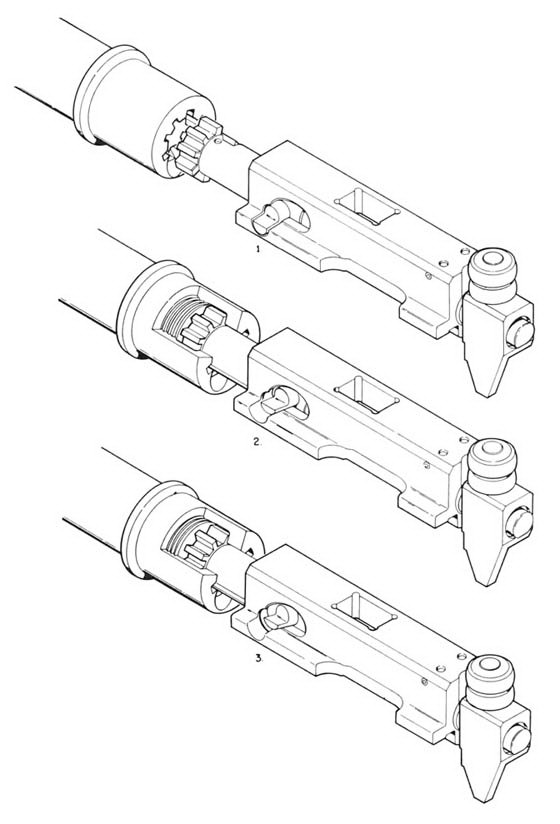 将工作部件装入机匣之前,枪机导柱必须正确地装入机框曲线槽中;