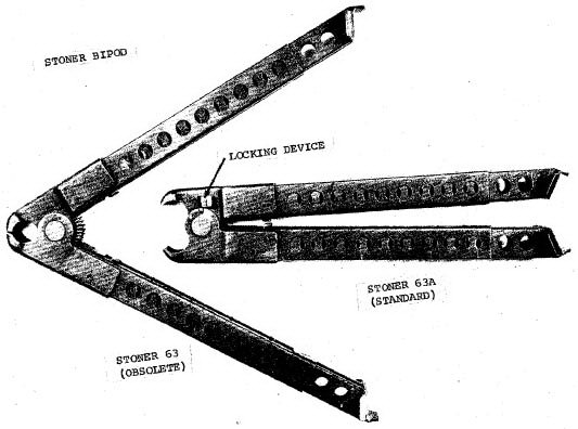 两脚架虽然是机枪型的标配,但可以用于任何一种型号上使用。斯通纳63A的两脚架增加了一个锁扣,能锁住折叠状态,使携带更方便