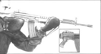扣压扳机,击发阻铁解脱击锤,击锤回转打击击针,击针击发枪弹。枪弹击发后,火药气体推弹头向前,部分火药气体进入位于枪管上方的活塞筒,迫使活塞后退。当枪机导柱在机框曲线槽的直线段中时,机框走完近5.1mm自由行程。在此期间,膛内压力下降。然后,枪机导柱与机框曲线槽的开锁螺旋面相互作用,枪机回转开锁。由于枪机回转开锁过程中没有向后的导程,所以没有预备抽壳,因此抽壳动作比较猛烈,拉壳钩所受的应力相应的也就大。开锁后,枪机、机框和活塞组件一起后座,抽出弹壳并向右抛出,同时压倒击锤。复进簧在后座过程中被压缩。当工作部件后座终了时,复进簧便推它们复进,重复上述自动循环。当弹匣里的枪弹打完,托弹板就顶起空仓挂机,把枪机挂在后方位置。