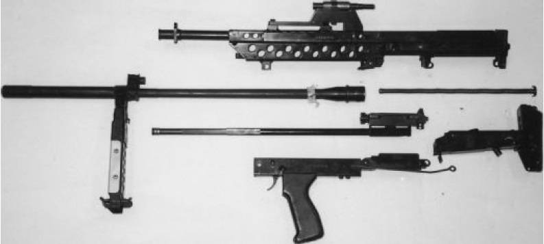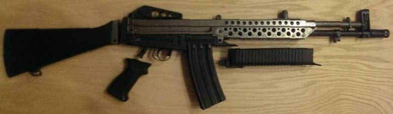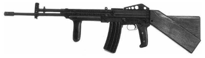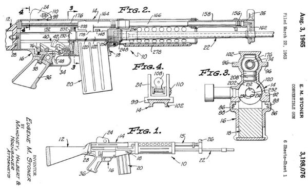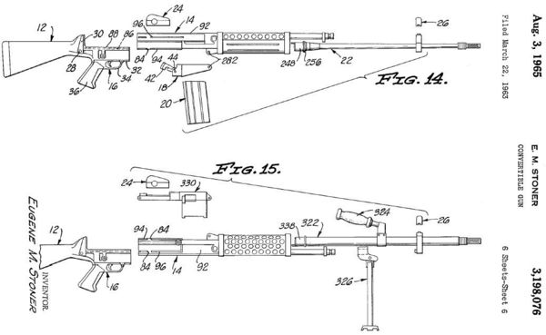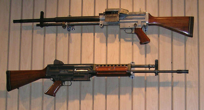 ![]() 7.62mm口径的斯通纳62原型,上面是轻机枪型,下面是步枪型 |