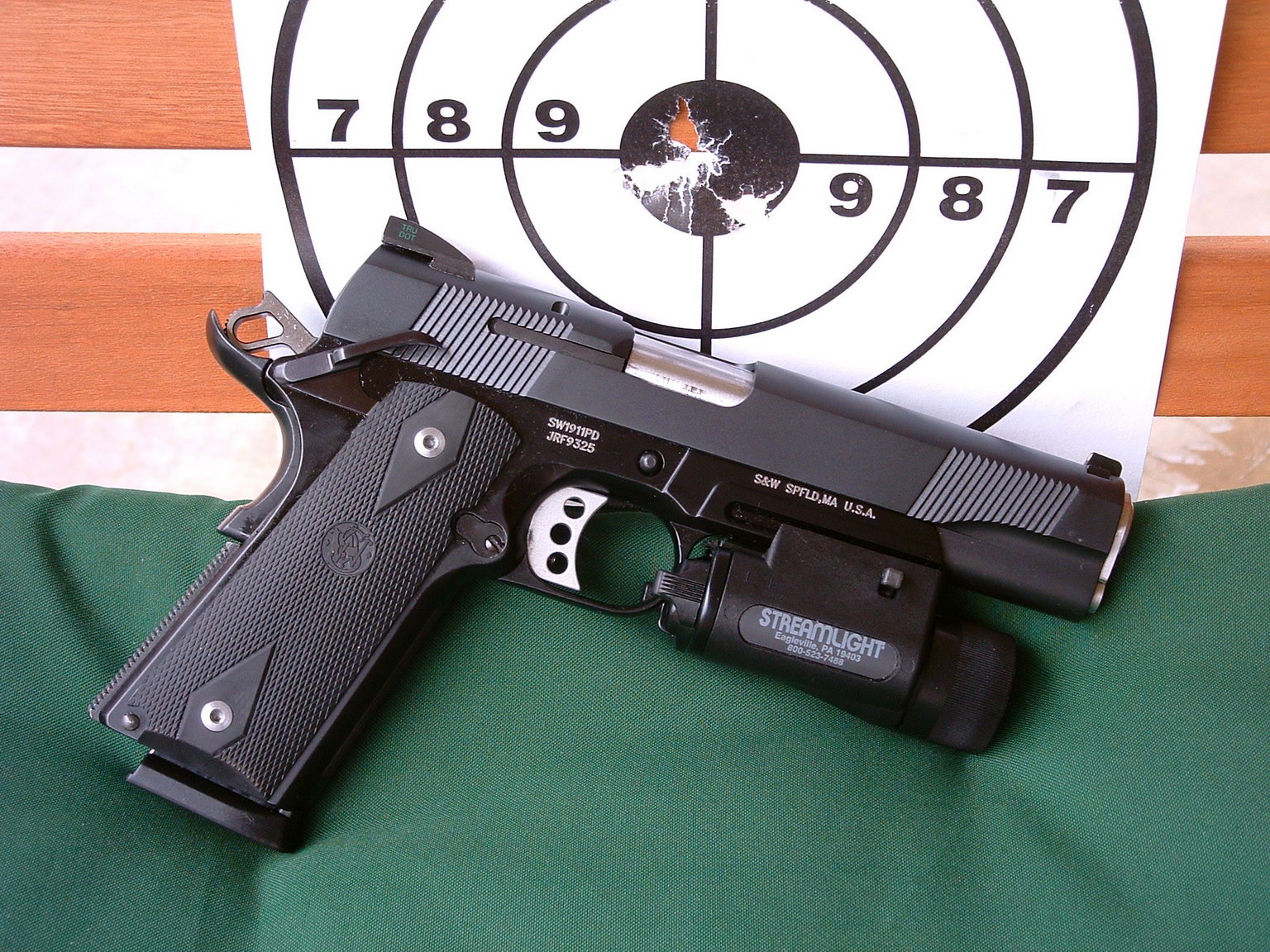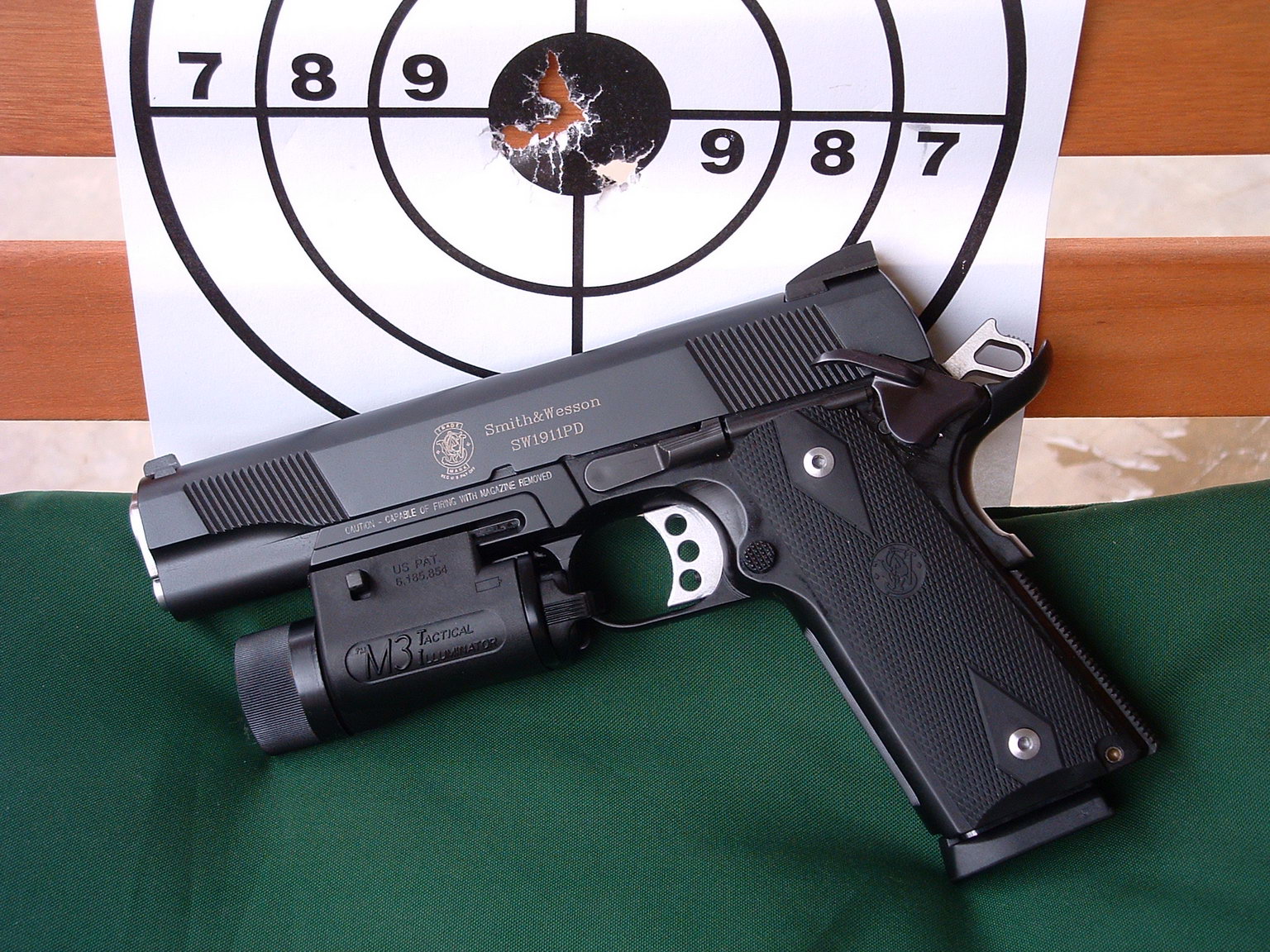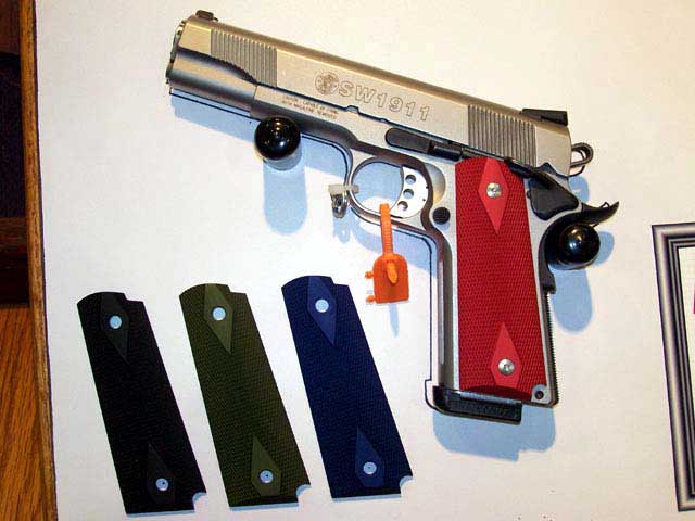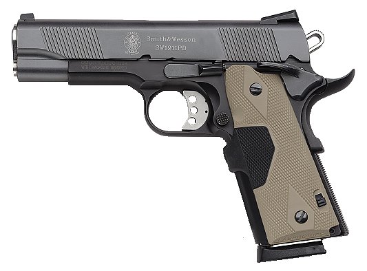 最新的SW1911PD型与时俱进地采用沙色的握把侧片,而且这是Crimson Trace的激光指示器握把侧片