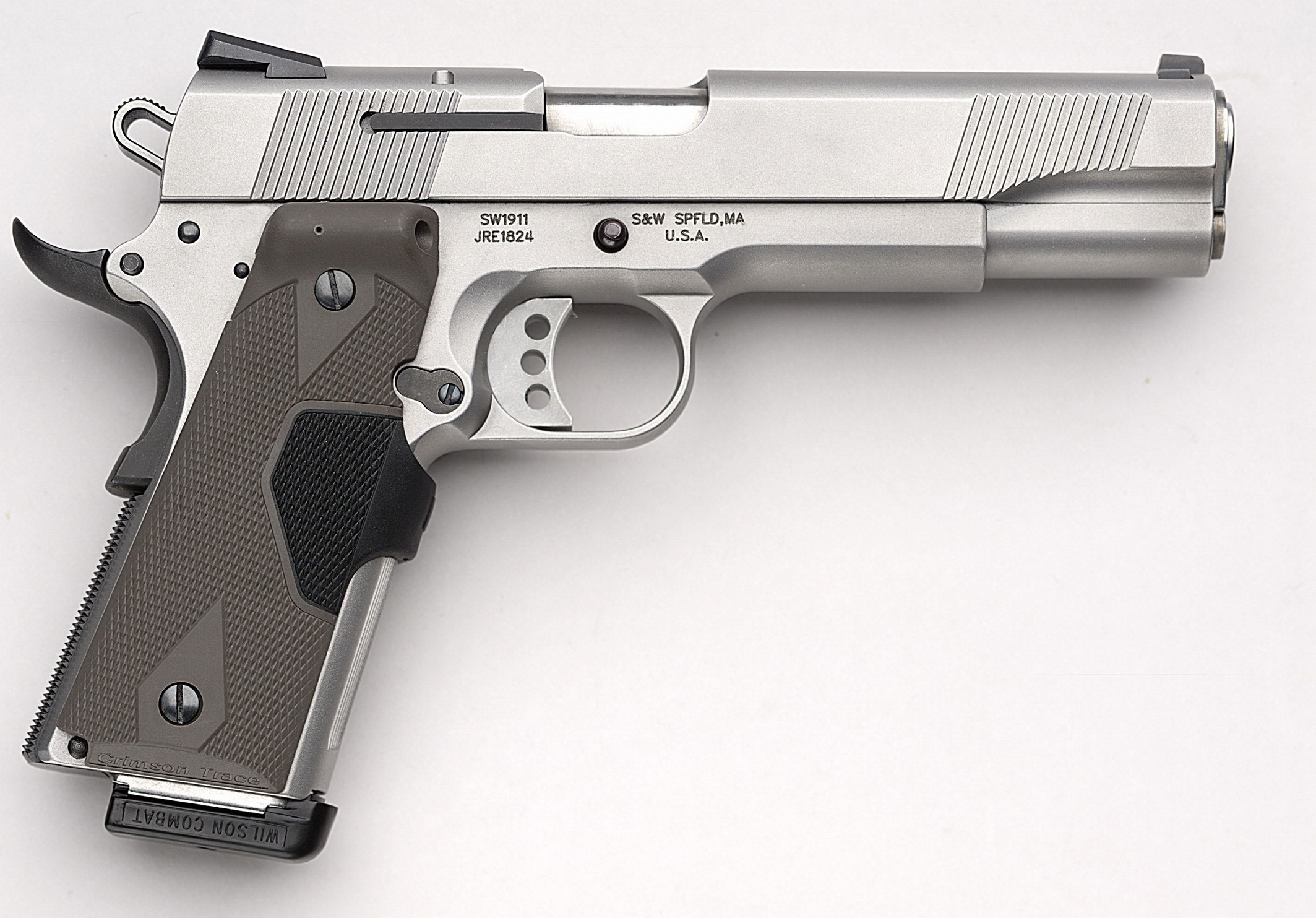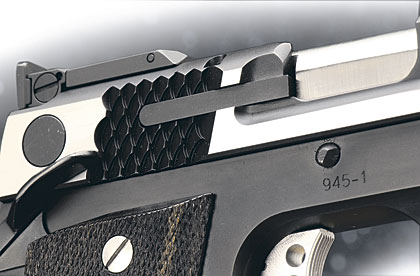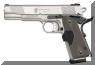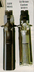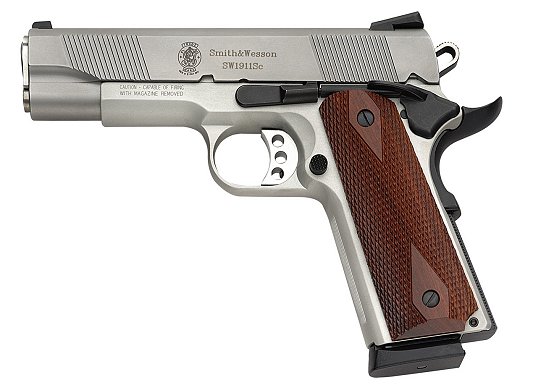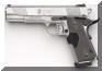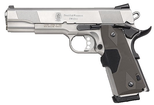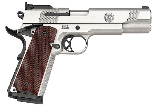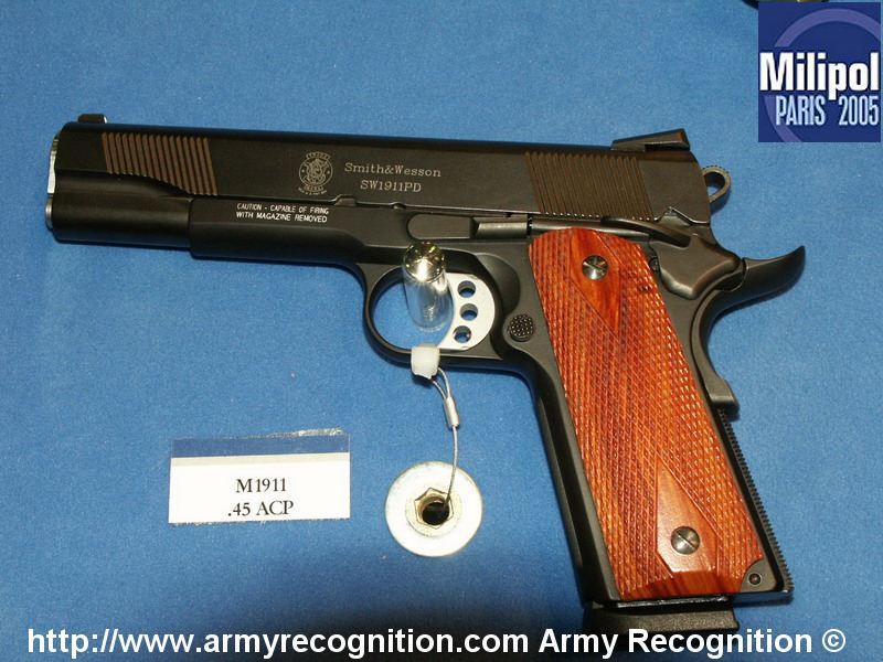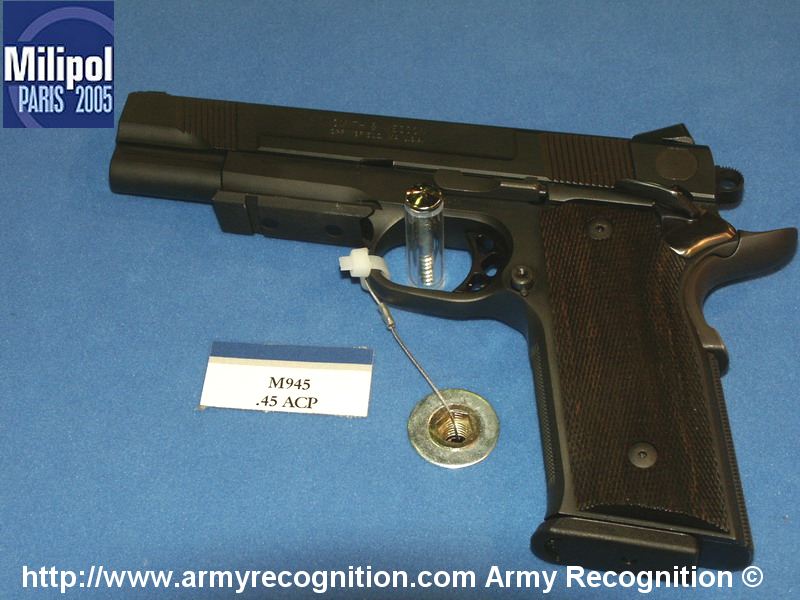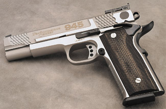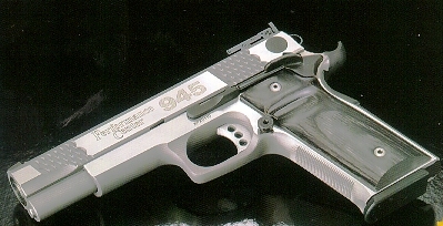 由于美国人的1911情结,很多大厂小厂都出1911手枪,S&W公司在20世纪末也终于决定在1911这个市场上锄一把,S&W公司在1998年SHOT SHOW推出了945型(Model 945)手枪。作为专门针对1911手枪市场的产品,945型本身没有太大的改变,除了套筒的外观采用特征显著的鱼鳞状防滑纹外,比较不容易发现的细微改进就是握把的角度和形状,据说比1911的原有设计更好。除此之外,945型套筒和底把均为不锈钢制品,握把侧板为木制件,弹匣为单排8发。据说945型射击起来后坐感较低,而且精度很好。不过945型在正式推出市场没多久,S&W公司就突然宣布该枪有严重设计缺陷,已经卖出的产品都需要召回工厂进行修理。