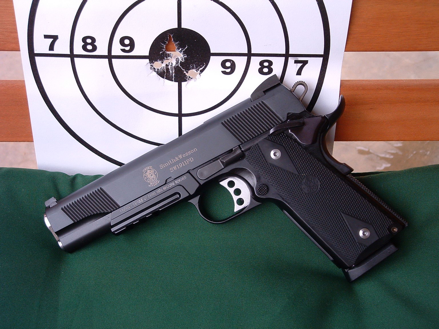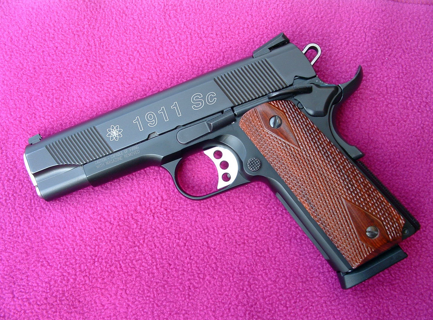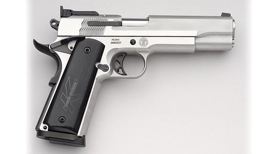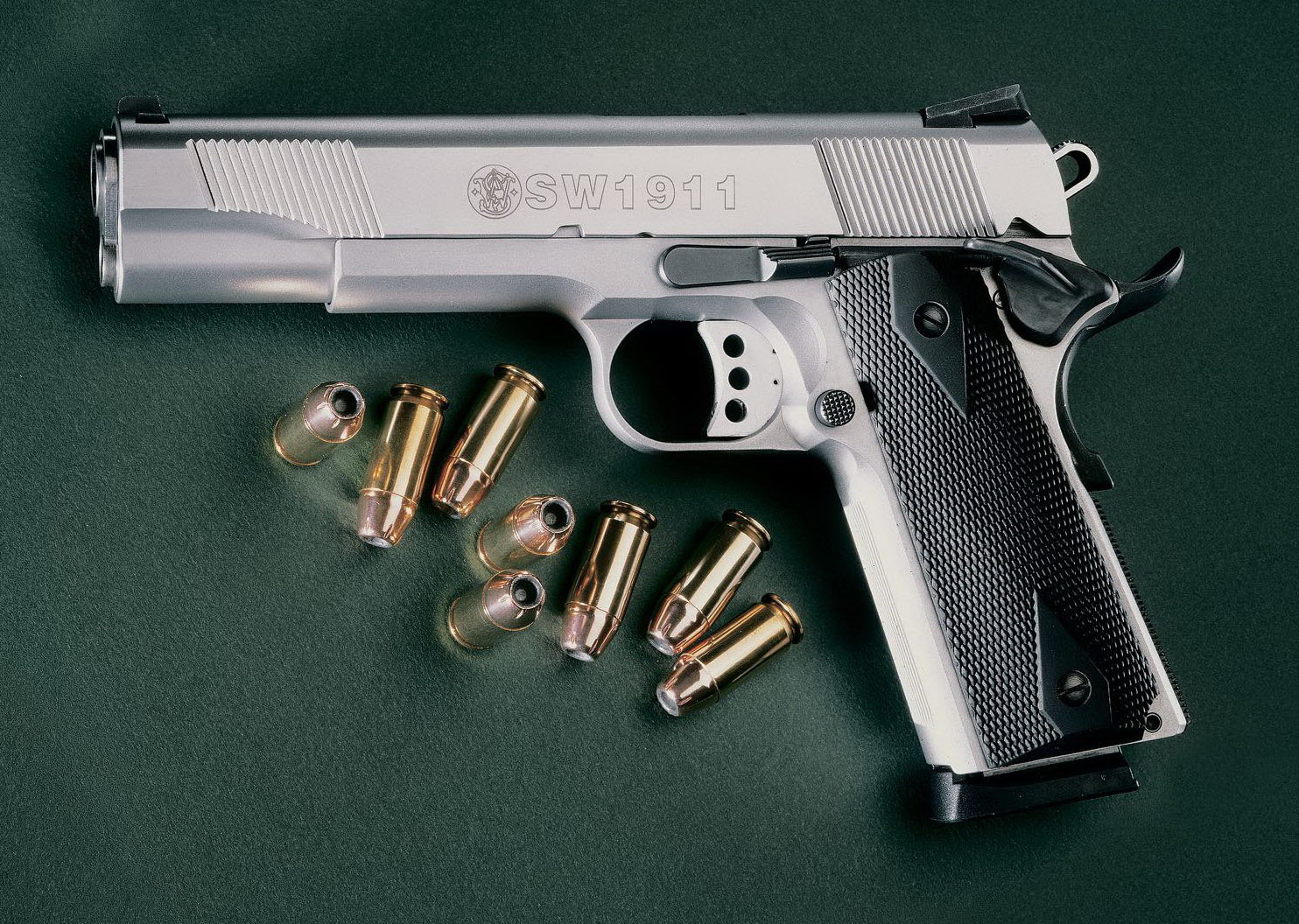 由于美国人的1911情结,很多大厂小厂都出1911手枪,S&W公司在20世纪末也终于决定在1911这个市场上锄一把,S&W公司在1998年SHOT SHOW推出了945型(Model 945)手枪。作为专门针对1911手枪市场的产品,945型本身没有太大的改变,除了套筒的外观采用特征显著的鱼鳞状防滑纹外,比较不容易发现的细微改进就是握把的角度和形状,据说比1911的原有设计更好。除此之外,945型套筒和底把均为不锈钢制品,握把侧板为木制件,弹匣为单排8发。据说945型射击起来后坐感较低,而且精度很好。不过945型在正式推出市场没多久,S&W公司就突然宣布该枪有严重设计缺陷,已经卖出的产品都需要召回工厂进行修理。