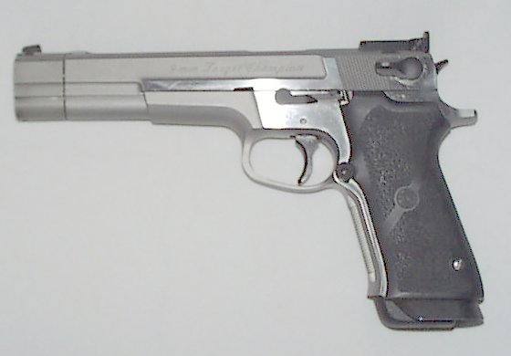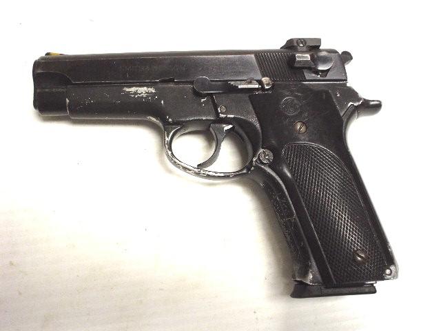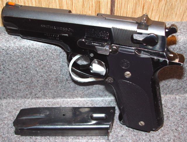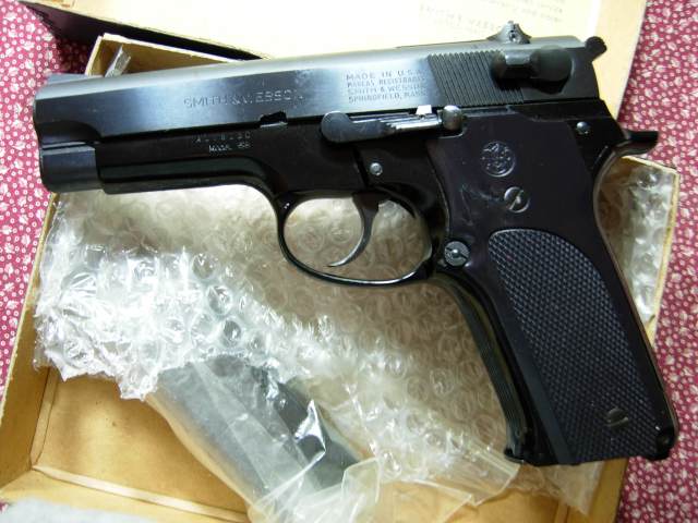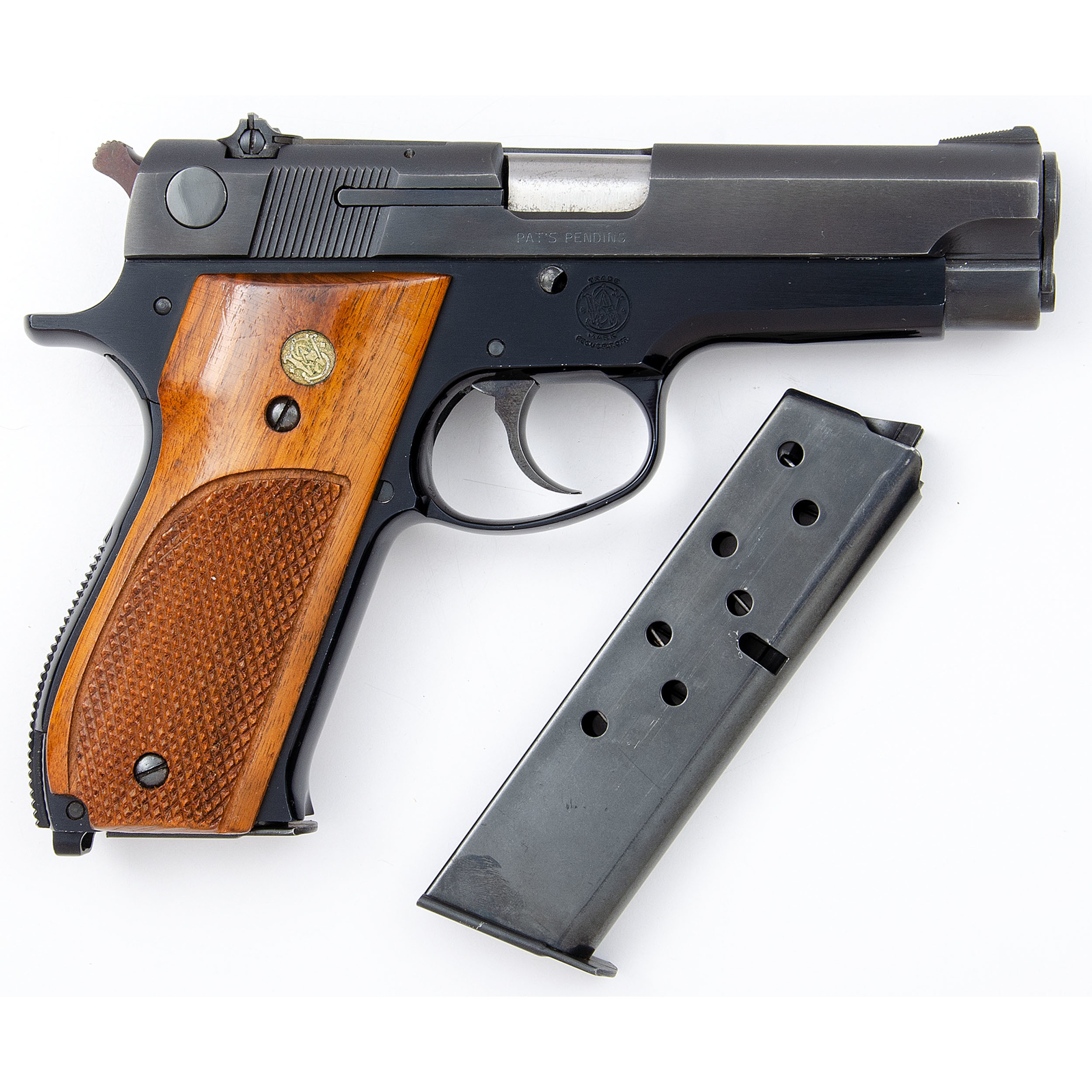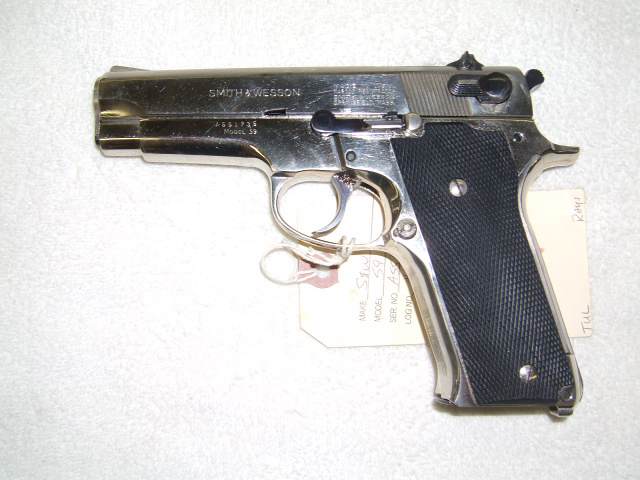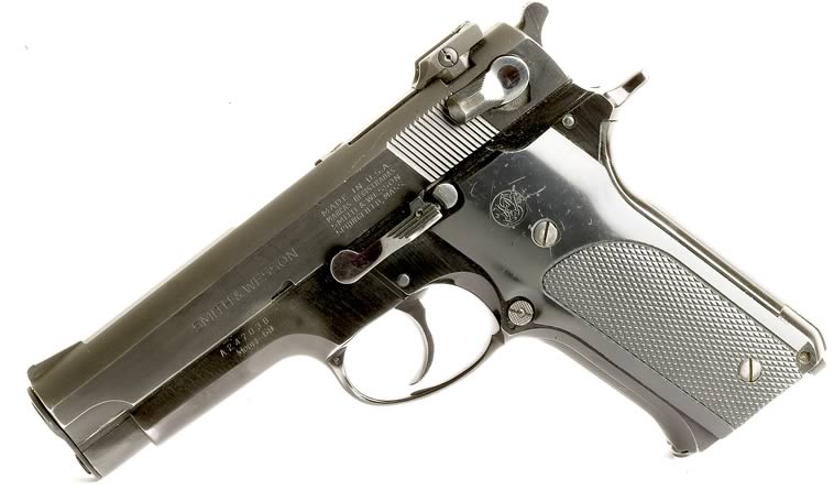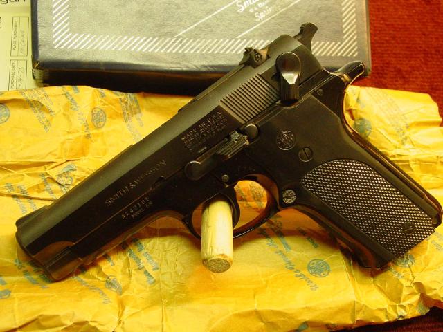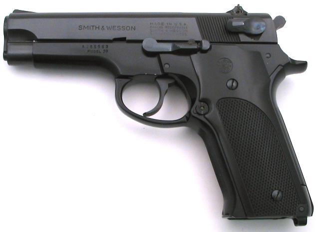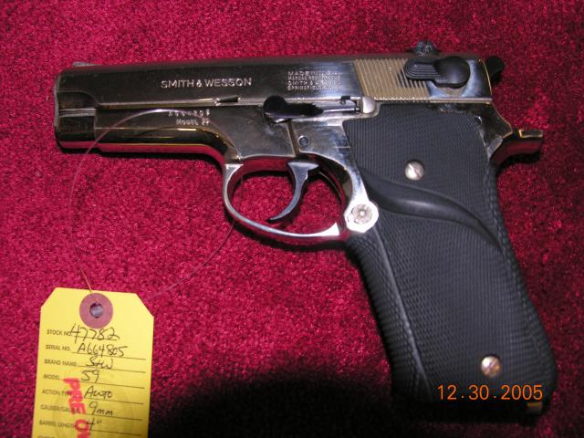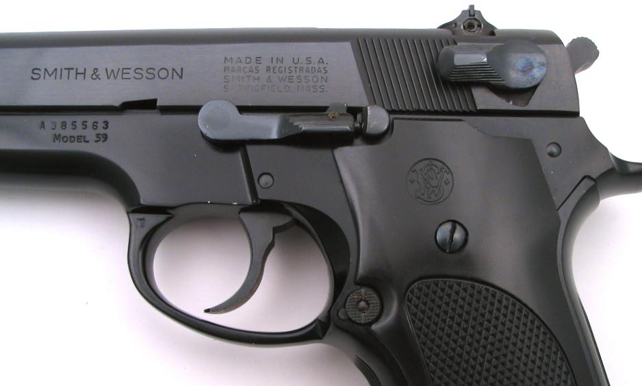 史密斯-韦森59型手枪仍然是S&W的第一代半自动手枪。采用9mm派拉贝鲁姆口径,采用一个加宽握把的阳极化处理铝合底把,以便能使用14发双排弹匣。外观上与39型手枪最明显的区别是握把背板为直线条设计,而39型手枪是曲线条背板。其他方面与39型手枪基本相同。59型手枪大都采用烤蓝的表面处理,但在1972年增加了镀镍型。