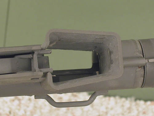 S&W M76(下)与MK-760(上)放在一起比较,两者区别不明显,但S&W M76的弹匣插座后面有S&W公司的标志