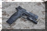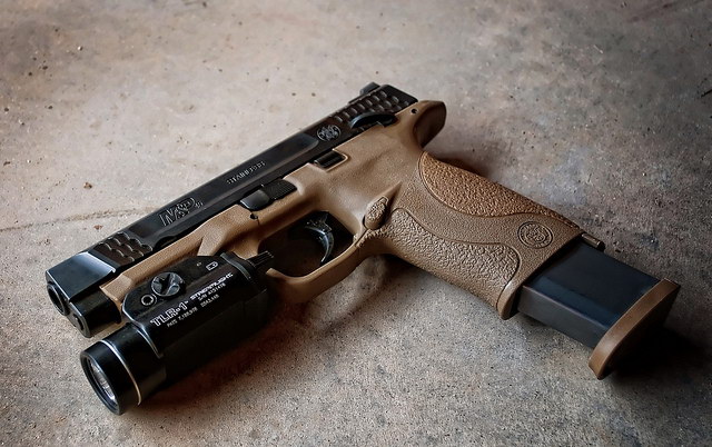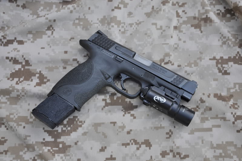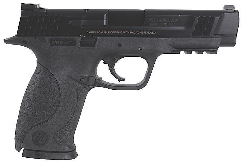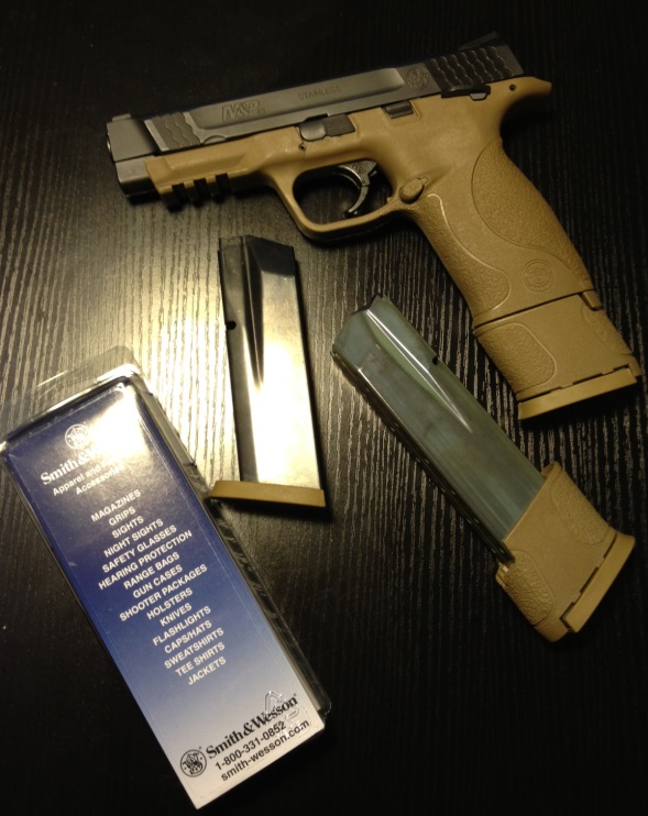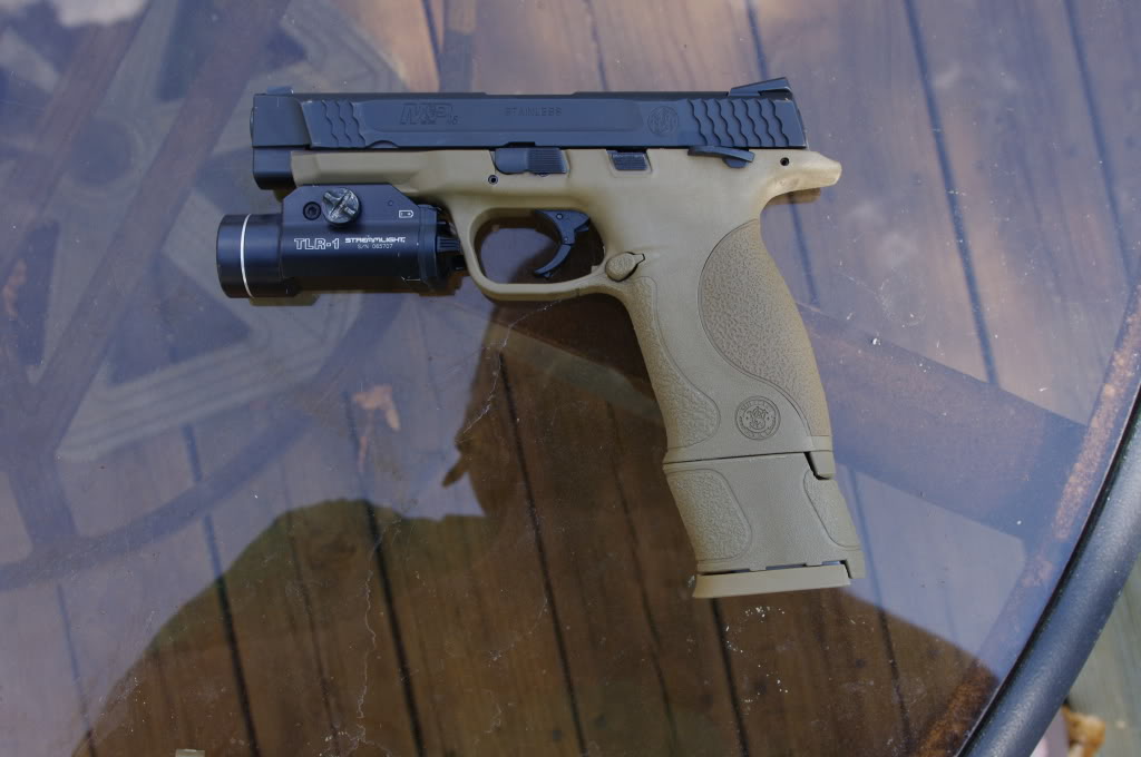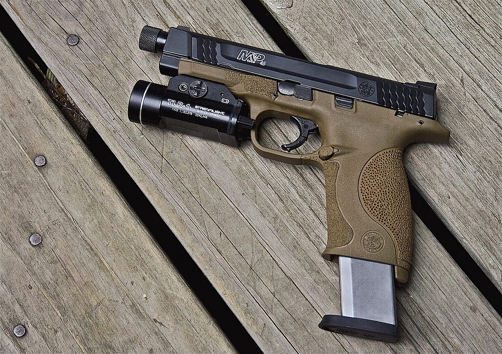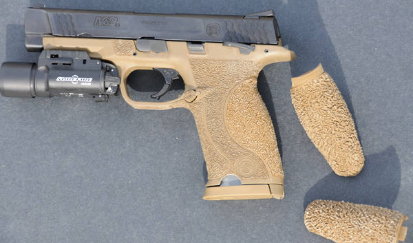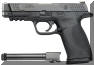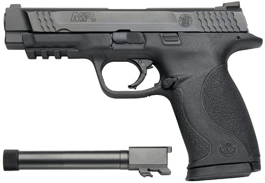 M&P45的全尺寸型,下方的枪管是增加了消声器螺纹的加长枪管