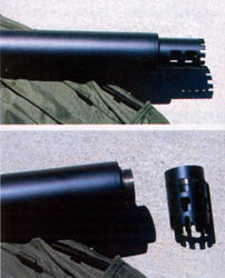 为了安全,Tac Ops公司为该消声器研制了一个外径50.8mm、长76.2mm称为“突破者”的不锈钢枪口附加装置,它能泄出火药燃气。这样,霰弹枪就能以枪门直接抵在门或门框上发射。而不会因消声器内压力过大导致枪管或消声器爆炸。消声器的口部有带螺纹的延长部,用以安装“突破者”。当不需要时,可以卸下,以减小“秘密12”霰弹枪的全长。“突破者”口部为锯齿状,能在与门接触时起防滑作用。其底部开有相当大的孔,作为泄气用。上部没有开孔,在进行破障行动时,确保使用者的安全。 |