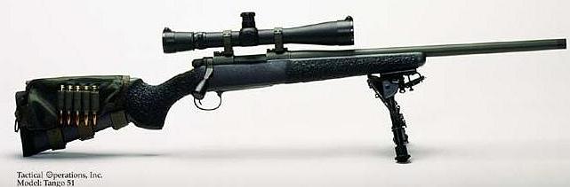 Tango 51第一次露面是在2000年4月份的《S.W.A.T.》杂志上。是Tac Ops公司以雷明登700为基础开发的狙击步枪,但枪管是采用Tac Ops自己制造的比赛枪管,有18英寸和24英寸两种长度,这种枪管并不比大多数雷明登700系列狙击步枪采用的5R枪管差。枪托为麦克米兰玻璃纤维枪托,看起来和M40A1的枪托有点相似,枪托表面有防滑纹。Tango 51也和其他雷明登700系列狙击步枪一样,采用哈里斯公司(Harris)两脚架。Tango 51配备有一个相当紧凑但高效的消声器,也是Tac Ops公司的产品,名为“Tac Ops 30”。Tango 51的最大特点就是重量很轻,在同级狙击步枪中是相当轻的。