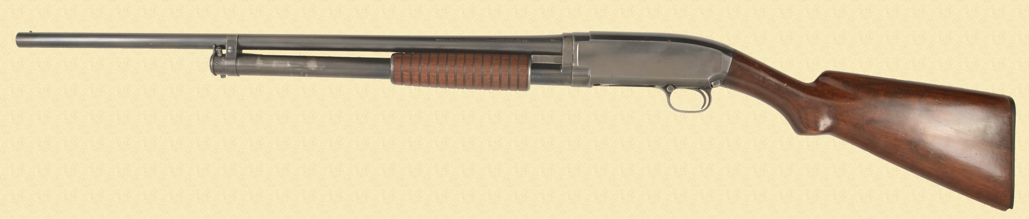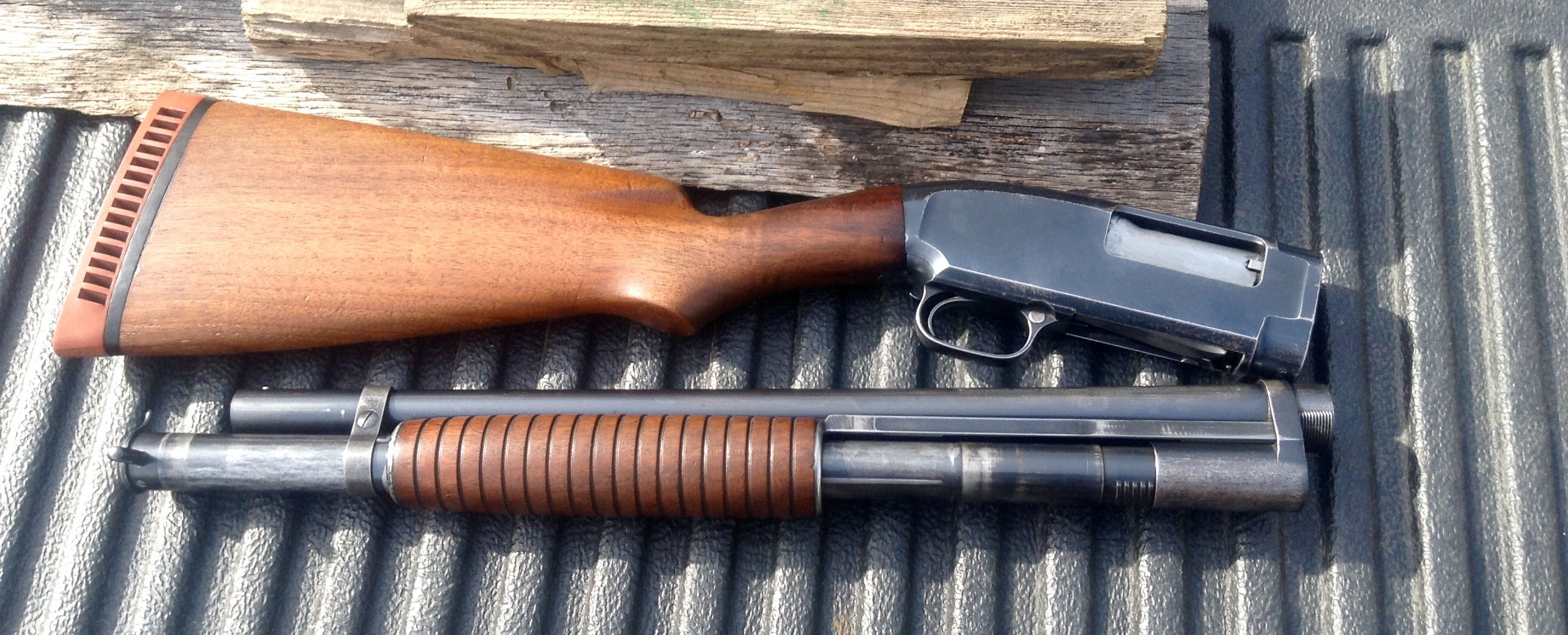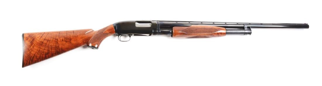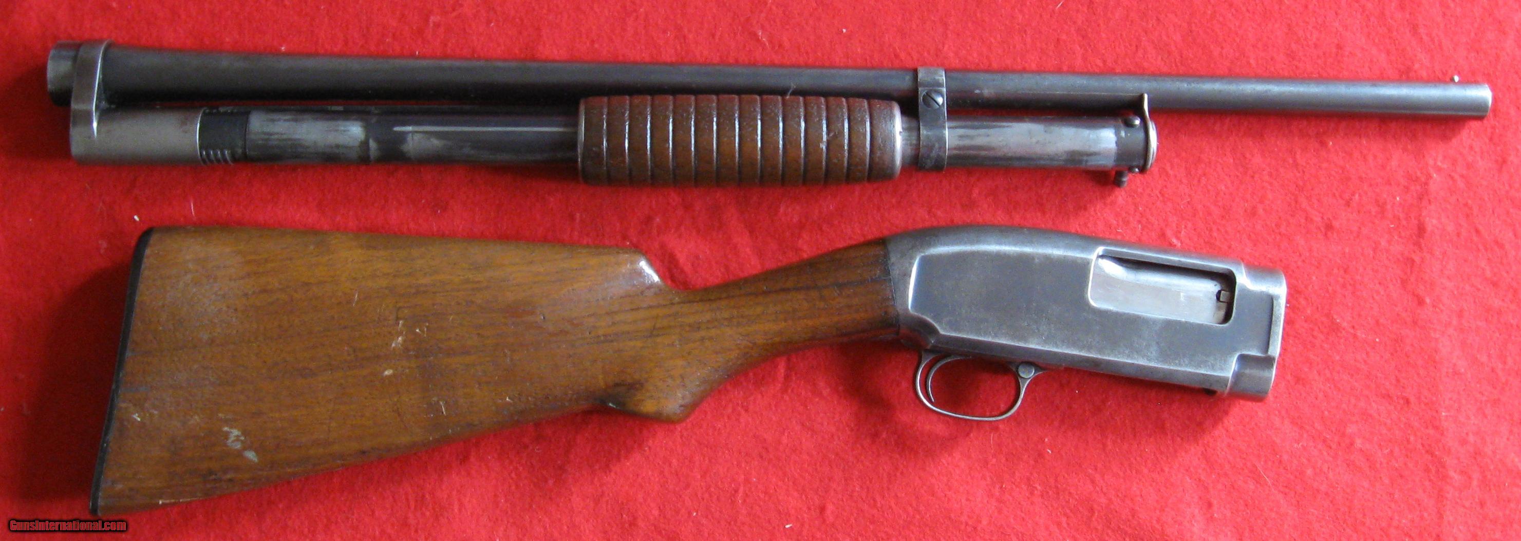 与有自己的独立工作室的勃朗宁不一样,托马斯·克罗斯利·约翰逊(Thomas Crossley Johnson)23岁起就已经在温彻斯特公司里工作,设计一种“无击锤”泵动霰弹枪的工作就交给了他。约翰逊沿用了温彻斯特1897型的基本思路,参考了史蒂文斯520型的设计,设计了一个由钢材锻造而成的后部封闭的流线型机匣,枪机和击锤都藏在机匣内运行,枪机也同样改为偏移式卡铁闭锁,闭锁卡铁向上进入机匣内的闭锁槽内进行闭锁,但在具体的结构设计上则回避了勃朗宁的专利。另外又增加了手动保险装置,但保险按钮不是像史蒂文斯520那样设置在扳机前方、扳机护圈内,而是设置在扳机护圈的前部,射手的手指自然伸直就能接触到。