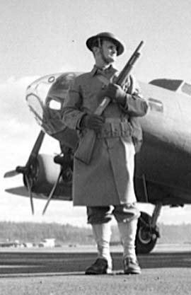 二战中,一名手持温彻斯特12型霰弹枪的美国陆军航空队的卫兵